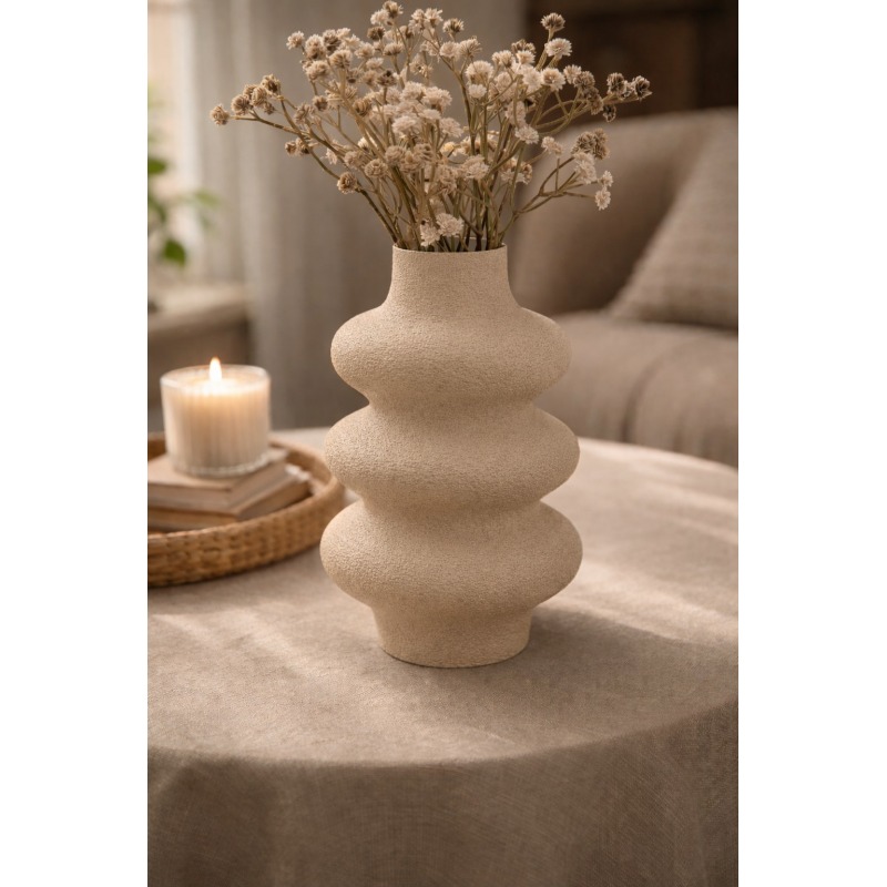 De vaas is perfect als statement piece op tafel, dressoir of plank – met droogbloemen, takken of gewoon op zichzelf. Dankzij het gelaagde 3D-ontwerp vangt hij het licht subtiel en blijft hij vanuit elke hoek interessant om te zien.