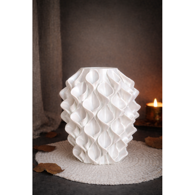 Deze moderne vaas is met zorg 3D geprint en heeft een elegant, organisch reliëf dat prachtig het licht vangt. De parelmoer witte afwerking geeft de vaas een luxe en tijdloze uitstraling. Perfect als eyecatcher in een modern, Scandinavisch of minimalistisch interieur.