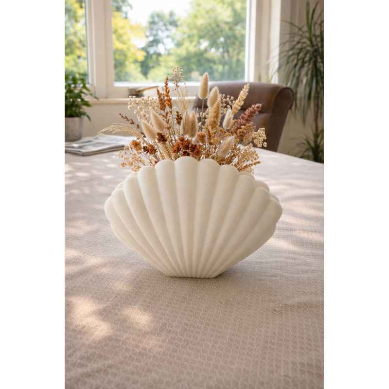 Stijlvolle 3D-geprinte vaas met een elegant schelpdesign. De vaas heeft een zachte uitstraling en past perfect in een modern, Scandinavisch of minimalistisch interieur. Mooi als los decoratief object of te combineren met droogbloemen (niet inbegrepen).