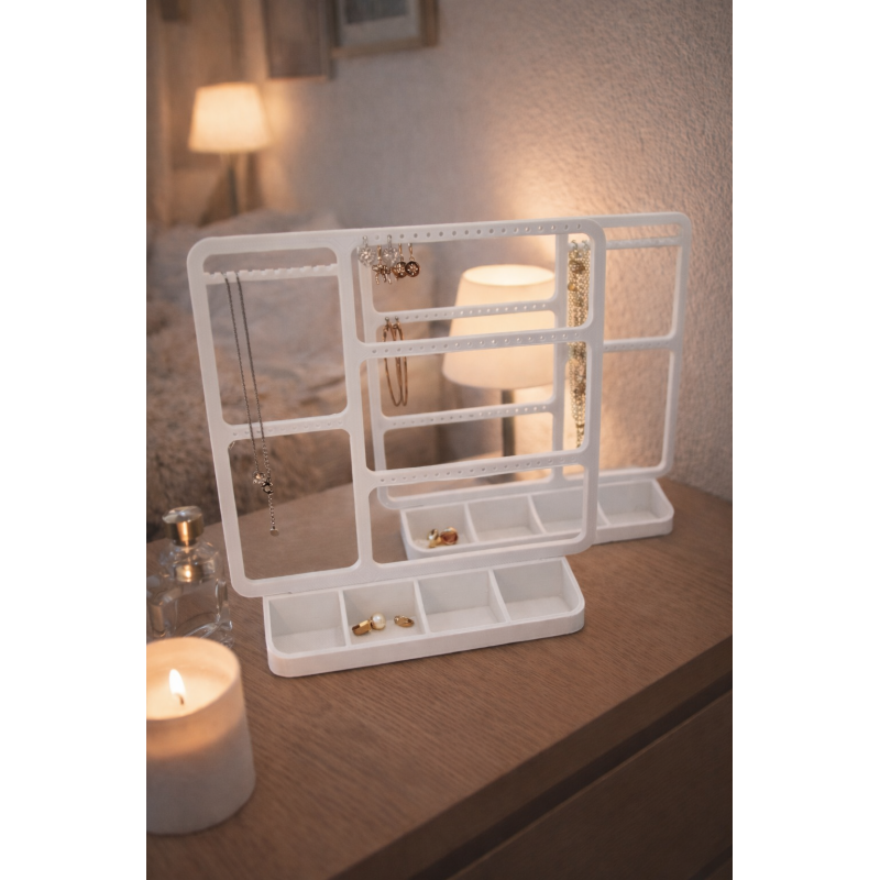 Dankzij de slimme indeling hang je kettingen en oorbellen overzichtelijk op, terwijl ringen en kleine accessoires netjes hun plek vinden in de vakjes onderaan. Geen knopen meer, geen zoekwerk – alleen rust en overzicht.